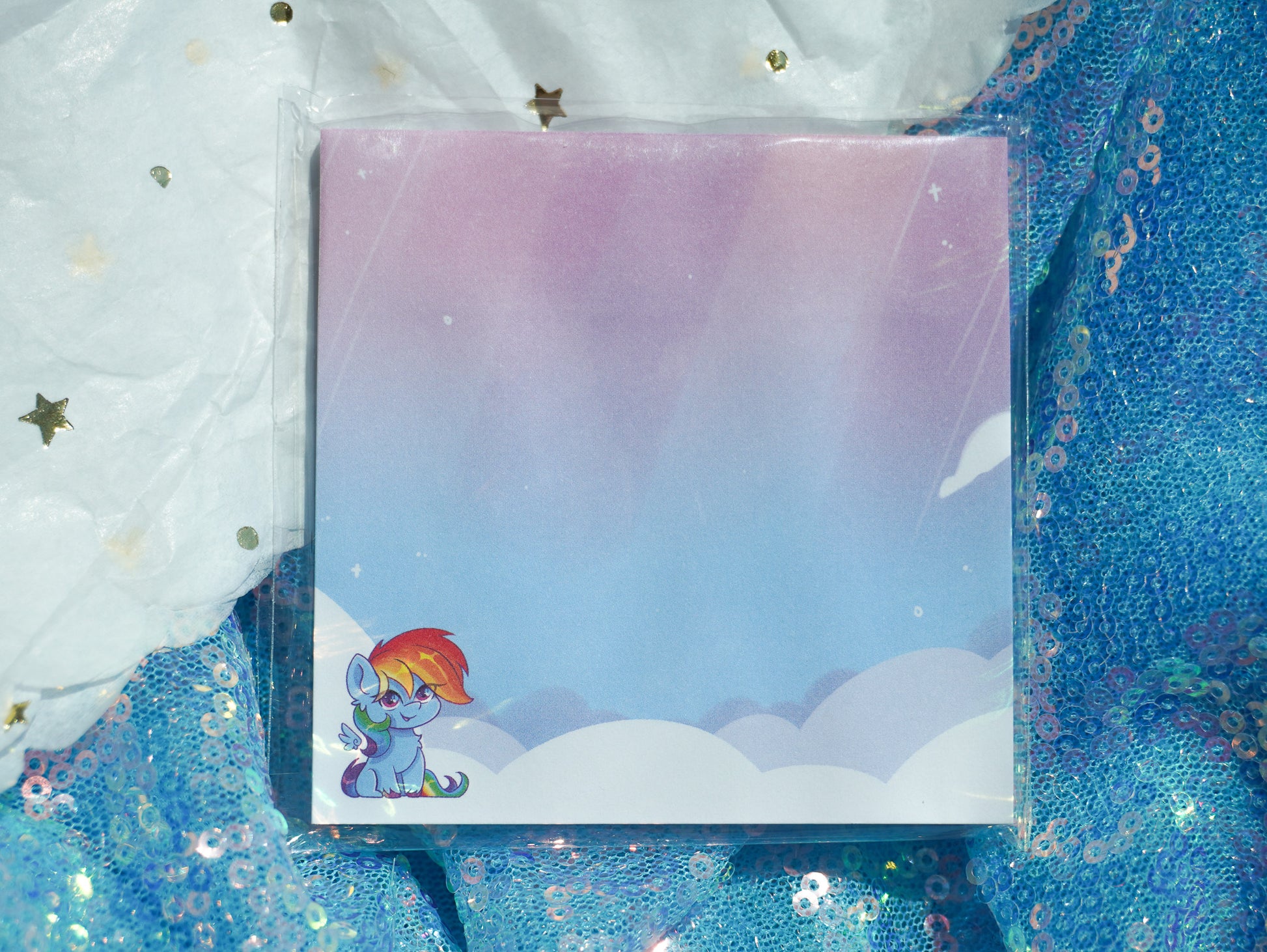 Stack of 50 3"x3" sticky notes, featuring a Rainbow Dash themed design!